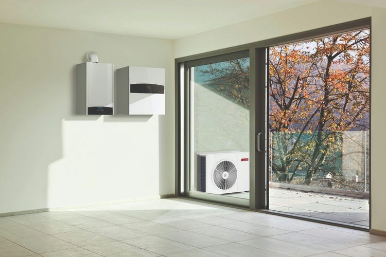 Sistema ibrido splittato Factory Made in classe A* costituito da caldaia a condensazione istantanea e pompa di calore con gas ecologico R32.