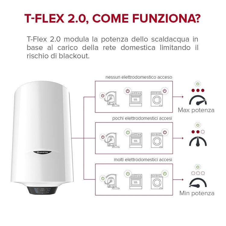Pro 1 Powerflex sfrutta tutta la potenza disponibile sulla rete per garantire prestazioni superiori. Grazie alla potenza massima di 2,5kw i tempi di riscaldamento dell’acqua possono essere ridotti fino al 50%**, lasciando automaticamente a T-Flex 2.0 il compito della sua gestione in base al carico della rete. * T-Flex 2.0 interviene solo sullo scaldacqua e segnala il sovraccarico di rete nel caso questo permanga anche dopo la sua entrata in funzione. ** Rispetto a uno scaldacqua elettrico standard da 1,2 kW.